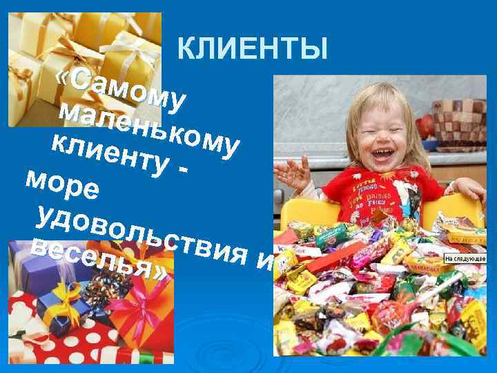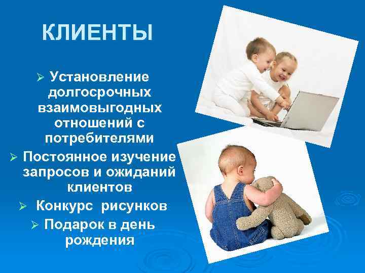 КЛИЕНТЫ Установление долгосрочных взаимовыгодных отношений с потребителями Ø Постоянное изучение запросов и ожиданий клиентов Ø Конкурс рисунков Ø Подарок в день рождения Ø