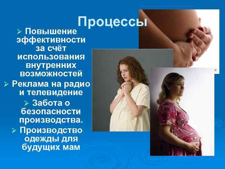 Процессы Повышение эффективности за счёт использования внутренних возможностей Ø Реклама на радио и телевидение Ø Забота о безопасности производства. Ø Производство одежды для будущих мам Ø