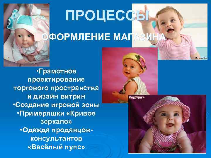 ПРОЦЕССЫ ОФОРМЛЕНИЕ МАГАЗИНА • Грамотное проектирование торгового пространства и дизайн витрин • Создание игровой зоны • Примеряшки «Кривое зеркало» • Одежда продавцовконсультантов «Весёлый пупс»