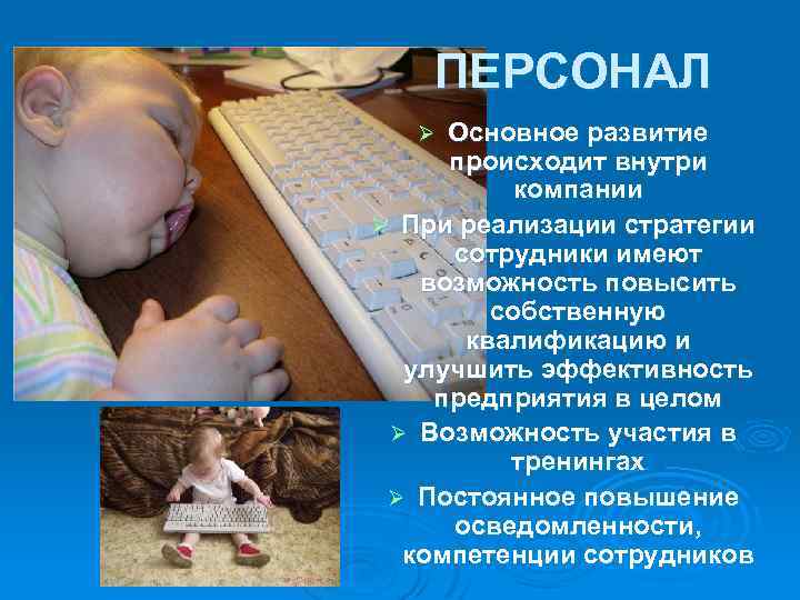 ПЕРСОНАЛ Основное развитие происходит внутри компании Ø При реализации стратегии сотрудники имеют возможность повысить собственную квалификацию и улучшить эффективность предприятия в целом Ø Возможность участия в тренингах Ø Постоянное повышение осведомленности, компетенции сотрудников Ø