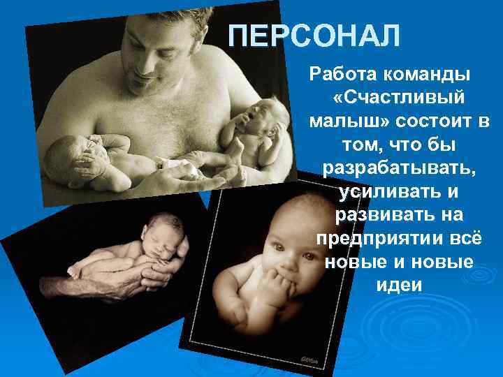 ПЕРСОНАЛ Работа команды «Счастливый малыш» состоит в том, что бы разрабатывать, усиливать и развивать на предприятии всё новые идеи