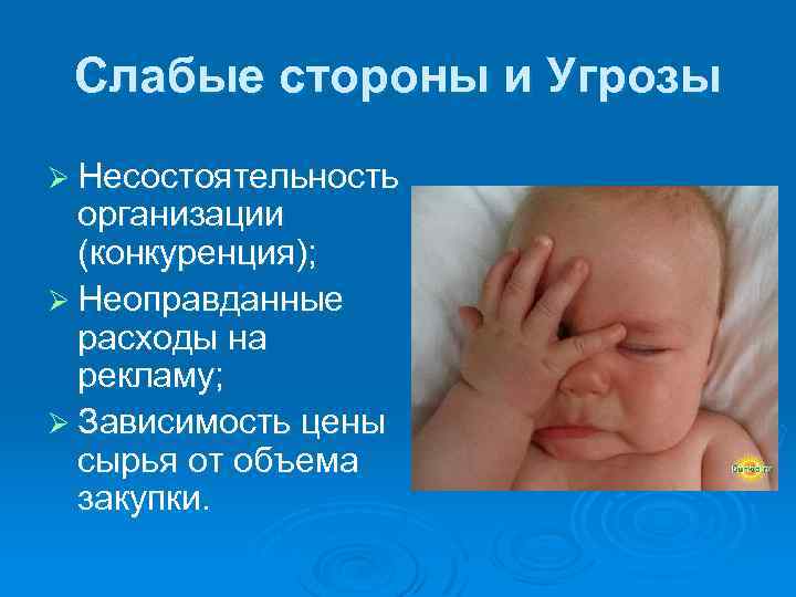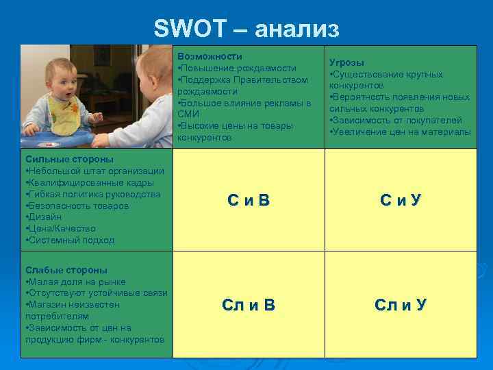 SWOT – анализ Возможности • Повышение рождаемости • Поддержка Правительством рождаемости • Большое влияние рекламы в СМИ • Высокие цены на товары конкурентов Угрозы • Существование крупных конкурентов • Вероятность появления новых сильных конкурентов • Зависимость от покупателей • Увеличение цен на материалы Сильные стороны • Небольшой штат организации • Квалифицированные кадры • Гибкая политика руководства • Безопасность товаров • Дизайн • Цена/Качество • Системный подход Си. В Си. У Слабые стороны • Малая доля на рынке • Отсутствуют устойчивые связи • Магазин неизвестен потребителям • Зависимость от цен на продукцию фирм - конкурентов Сл и В Сл и У