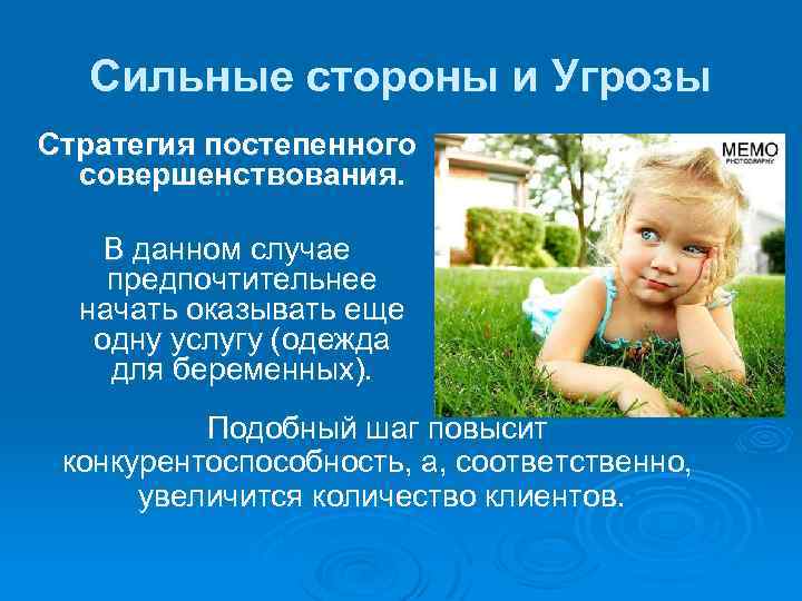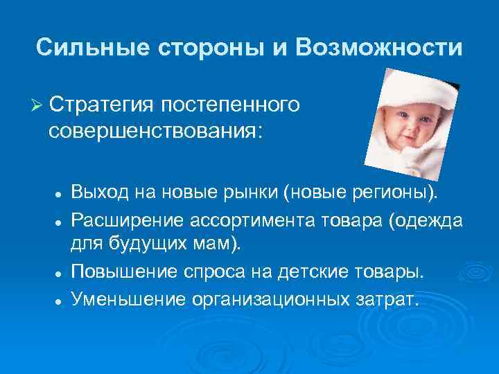 Сильные стороны и Возможности Ø Стратегия постепенного совершенствования: l l Выход на новые рынки (новые регионы). Расширение ассортимента товара (одежда для будущих мам). Повышение спроса на детские товары. Уменьшение организационных затрат.