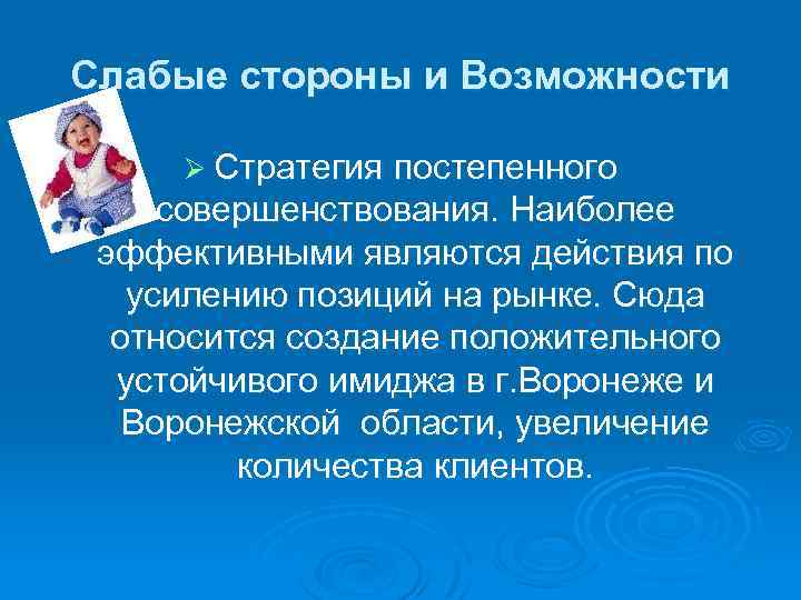 Слабые стороны и Возможности Ø Стратегия постепенного совершенствования. Наиболее эффективными являются действия по усилению позиций на рынке. Сюда относится создание положительного устойчивого имиджа в г. Воронеже и Воронежской области, увеличение количества клиентов.