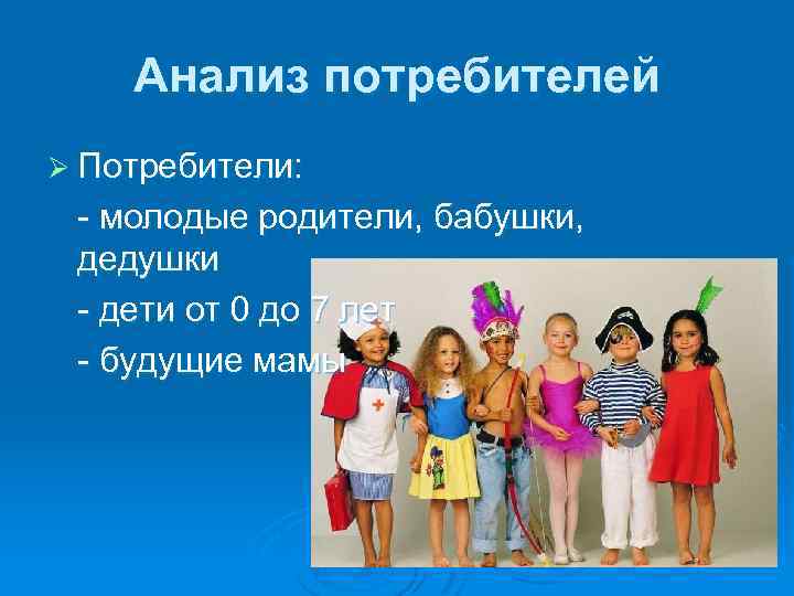 Анализ потребителей Ø Потребители: - молодые родители, бабушки, дедушки - дети от 0 до 7 лет - будущие мамы