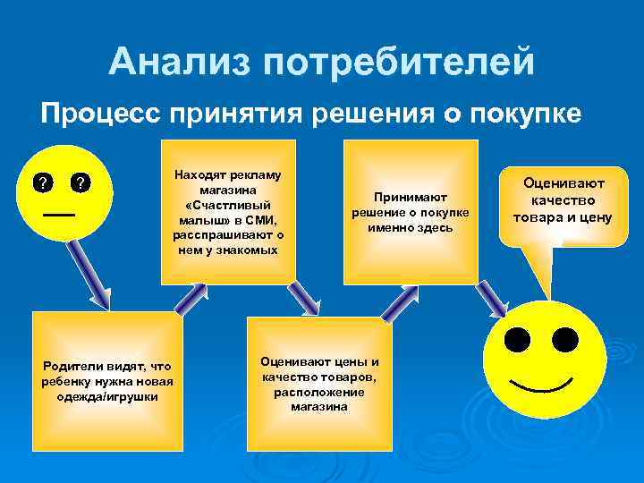 Анализ потребителей Процесс принятия решения о покупке ? ? Находят рекламу магазина «Счастливый малыш» в СМИ, расспрашивают о нем у знакомых Родители видят, что ребенку нужна новая одежда/игрушки Принимают решение о покупке именно здесь Оценивают цены и качество товаров, расположение магазина Оценивают качество товара и цену