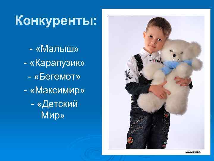Конкуренты: - «Малыш» - «Карапузик» - «Бегемот» - «Максимир» - «Детский Мир»