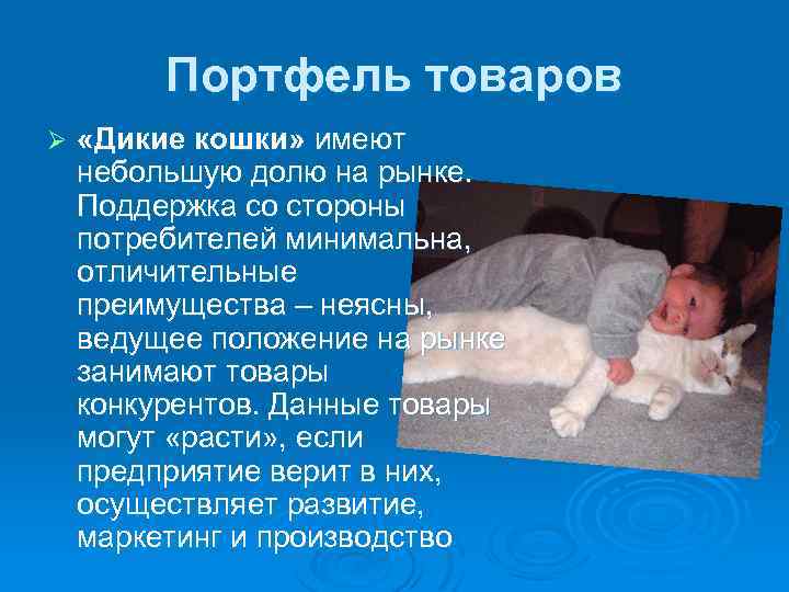 Портфель товаров Ø «Дикие кошки» имеют небольшую долю на рынке. Поддержка со стороны потребителей минимальна, отличительные преимущества – неясны, ведущее положение на рынке занимают товары конкурентов. Данные товары могут «расти» , если предприятие верит в них, осуществляет развитие, маркетинг и производство