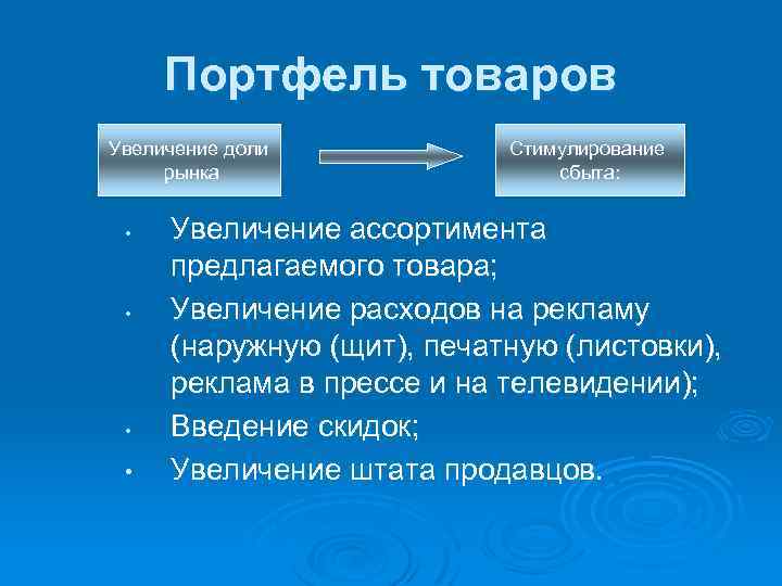 Портфель товаров Увеличение доли рынка • • Стимулирование сбыта: Увеличение ассортимента предлагаемого товара; Увеличение расходов на рекламу (наружную (щит), печатную (листовки), реклама в прессе и на телевидении); Введение скидок; Увеличение штата продавцов.