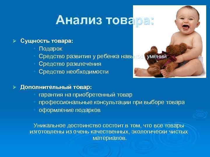 Анализ товара: Ø Сущность товара: • Подарок • Средство развития у ребенка навыков, умений • Средство развлечения • Средство необходимости Ø Дополнительный товар: • гарантия на приобретенный товар • профессиональные консультации при выборе товара • оформление подарков Уникальное достоинство состоит в том, что все товары изготовлены из очень качественных, экологически чистых материалов.