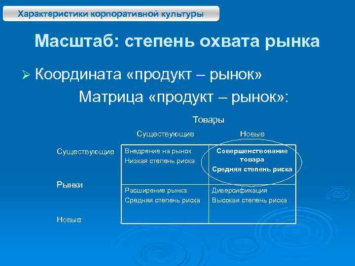 Характеристики корпоративной культуры Масштаб: степень охвата рынка Ø Координата «продукт – рынок» Матрица «продукт – рынок» : Товары Существующие Рынки Новые Внедрение на рынок Низкая степень риска Совершенствование товара Средняя степень риска Расширение рынка Средняя степень риска Диверсификация Высокая степень риска
