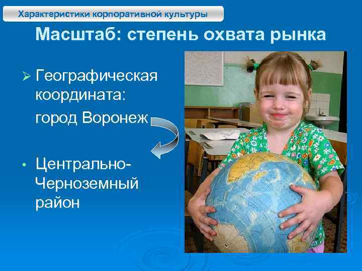 Характеристики корпоративной культуры Масштаб: степень охвата рынка Ø Географическая координата: город Воронеж • Центрально. Черноземный район