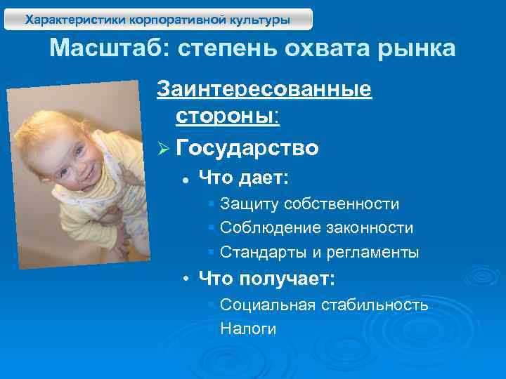 Характеристики корпоративной культуры Масштаб: степень охвата рынка Заинтересованные стороны: Ø Государство l Что дает: § Защиту собственности § Соблюдение законности § Стандарты и регламенты • Что получает: § Социальная стабильность § Налоги