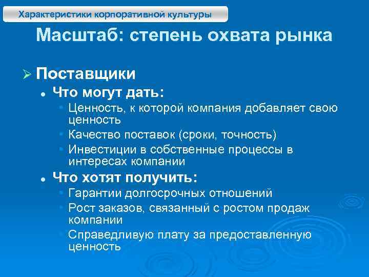Характеристики корпоративной культуры Масштаб: степень охвата рынка Ø Поставщики l Что могут дать: • Ценность, к которой компания добавляет свою ценность • Качество поставок (сроки, точность) • Инвестиции в собственные процессы в интересах компании l Что хотят получить: • Гарантии долгосрочных отношений • Рост заказов, связанный с ростом продаж компании • Справедливую плату за предоставленную ценность