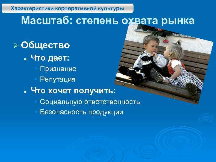 Характеристики корпоративной культуры Масштаб: степень охвата рынка Ø Общество l Что дает: • Признание • Репутация l Что хочет получить: • Социальную ответственность • Безопасность продукции