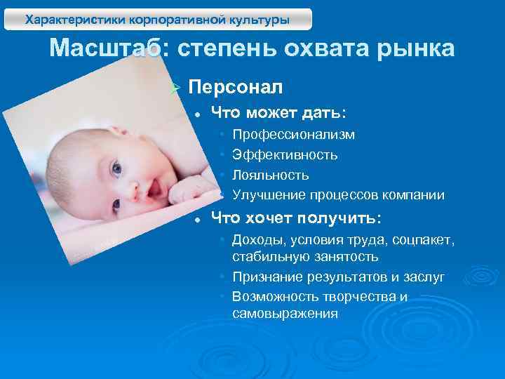Характеристики корпоративной культуры Масштаб: степень охвата рынка Ø Персонал l Что может дать: • • l Профессионализм Эффективность Лояльность Улучшение процессов компании Что хочет получить: • Доходы, условия труда, соцпакет, стабильную занятость • Признание результатов и заслуг • Возможность творчества и самовыражения