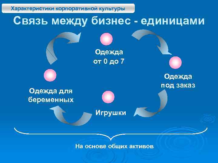 Характеристики корпоративной культуры Связь между бизнес - единицами Одежда от 0 до 7 Одежда под заказ Одежда для беременных Игрушки На основе общих активов