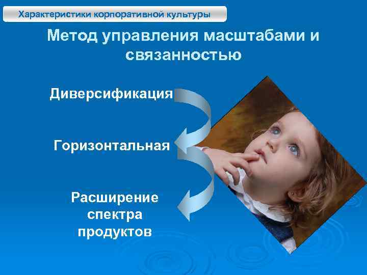 Характеристики корпоративной культуры Метод управления масштабами и связанностью Диверсификация Горизонтальная Расширение спектра продуктов