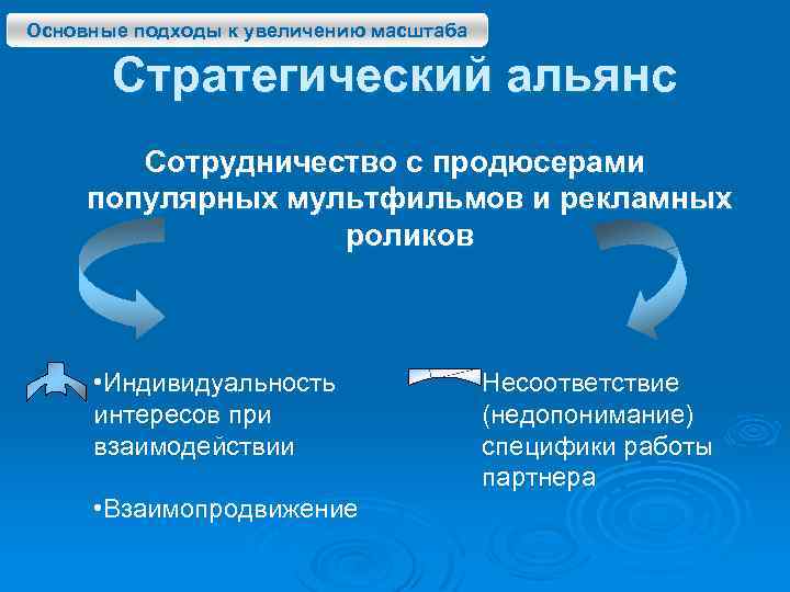 Основные подходы к увеличению масштаба Стратегический альянс Сотрудничество с продюсерами популярных мультфильмов и рекламных роликов • Индивидуальность интересов при взаимодействии • Взаимопродвижение Несоответствие (недопонимание) специфики работы партнера