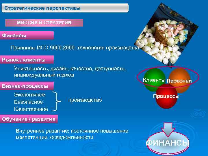 Стратегические перспективы МИССИЯ И СТРАТЕГИЯ Финансы Принципы ИСО 9000: 2000, технология производства Рынок / клиенты Уникальность, дизайн, качество, доступность, индивидуальный подход Бизнес-процессы Экологичное Безопасное Качественное производство Клиенты Персонал Процессы Обучение / развитие Внутреннее развитие; постоянное повышение компетенции, осведомленности ФИНАНСЫ