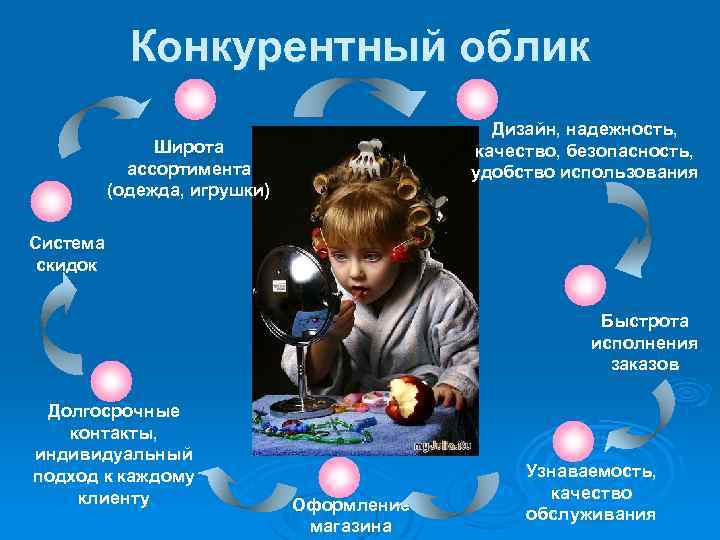 Конкурентный облик Дизайн, надежность, качество, безопасность, удобство использования Широта ассортимента (одежда, игрушки) Система скидок Быстрота исполнения заказов Долгосрочные контакты, индивидуальный подход к каждому клиенту Оформление магазина Узнаваемость, качество обслуживания
