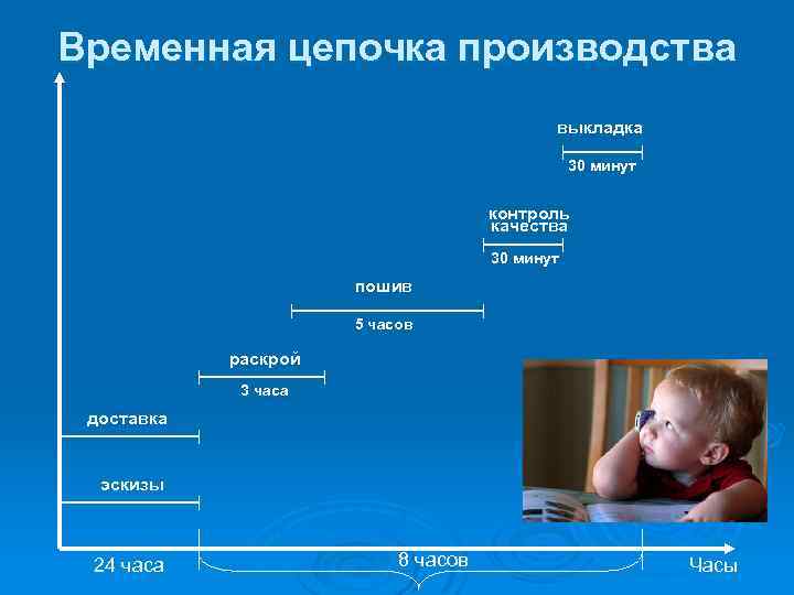Временная цепочка производства выкладка 30 минут контроль качества 30 минут пошив 5 часов раскрой 3 часа доставка эскизы 24 часа 8 часов Часы