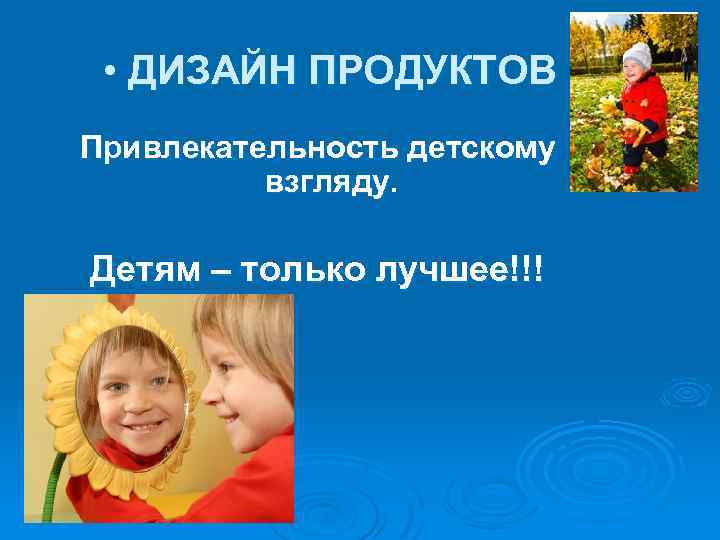 • ДИЗАЙН ПРОДУКТОВ Привлекательность детскому взгляду. Детям – только лучшее!!!