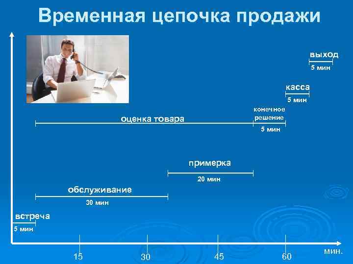 Временная цепочка продажи выход 5 мин касса 5 мин конечное решение оценка товара 5 мин примерка 20 мин обслуживание 30 мин встреча 5 мин 15 30 45 60 мин.