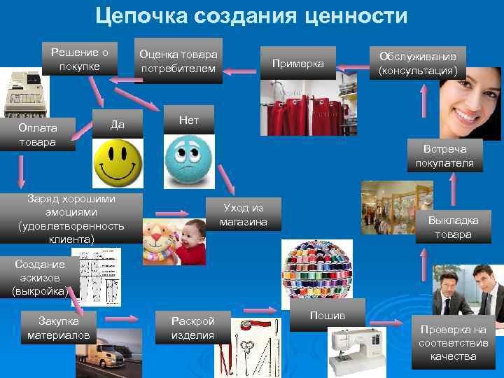 Цепочка создания ценности Решение о покупке Оплата товара Оценка товара потребителем Да Примерка Обслуживание (консультация) Нет Встреча покупателя Заряд хорошими эмоциями (удовлетворенность клиента) Уход из магазина Выкладка товара Создание эскизов (выкройка) Закупка материалов Раскрой изделия Пошив Проверка на соответствие качества