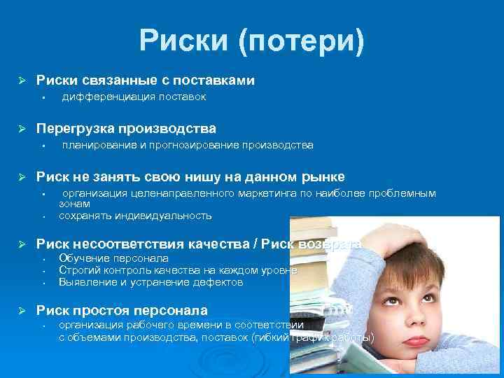 Риски (потери) Ø Риски связанные с поставками • Ø Перегрузка производства • Ø • организация целенаправленного маркетинга по наиболее проблемным зонам сохранять индивидуальность Риск несоответствия качества / Риск возврата • • • Ø планирование и прогнозирование производства Риск не занять свою нишу на данном рынке • Ø дифференциация поставок Обучение персонала Строгий контроль качества на каждом уровне Выявление и устранение дефектов Риск простоя персонала • организация рабочего времени в соответствии с объемами производства, поставок (гибкий график работы)