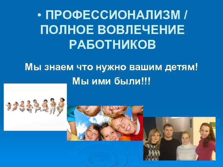 • ПРОФЕССИОНАЛИЗМ / ПОЛНОЕ ВОВЛЕЧЕНИЕ РАБОТНИКОВ Мы знаем что нужно вашим детям! Мы ими были!!!
