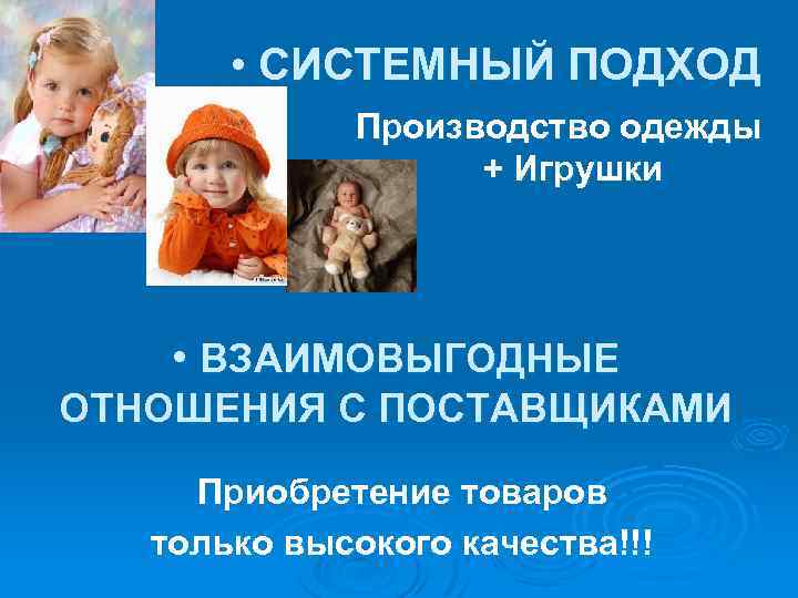 • СИСТЕМНЫЙ ПОДХОД Производство одежды + Игрушки • ВЗАИМОВЫГОДНЫЕ ОТНОШЕНИЯ С ПОСТАВЩИКАМИ Приобретение товаров только высокого качества!!!