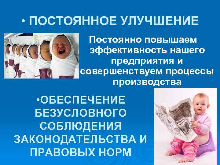 • ПОСТОЯННОЕ УЛУЧШЕНИЕ Постоянно повышаем эффективность нашего предприятия и совершенствуем процессы производства • ОБЕСПЕЧЕНИЕ БЕЗУСЛОВНОГО СОБЛЮДЕНИЯ ЗАКОНОДАТЕЛЬСТВА И ПРАВОВЫХ НОРМ