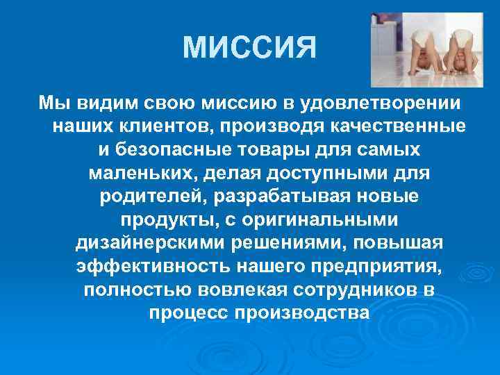 МИССИЯ Мы видим свою миссию в удовлетворении наших клиентов, производя качественные и безопасные товары для самых маленьких, делая доступными для родителей, разрабатывая новые продукты, с оригинальными дизайнерскими решениями, повышая эффективность нашего предприятия, полностью вовлекая сотрудников в процесс производства