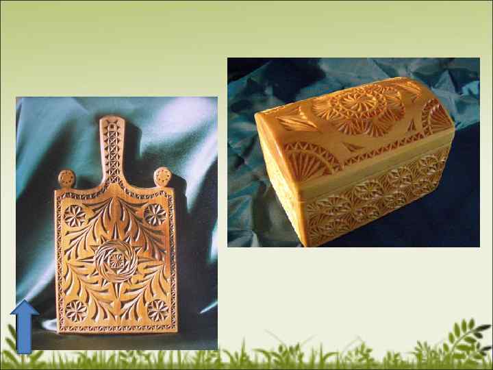 Wood carving Vyatka people also made and make articles of wood. The plasticity of lime-tree and aspen-tree is used by craftsmen in carving fashion boxes, panels, napkin- and pen–holders. The designs on them are made of grooves and cuts in the form of flowers, leaves, snowflakes and geometrical figures. • Some items are skillfully inlaid with straw.