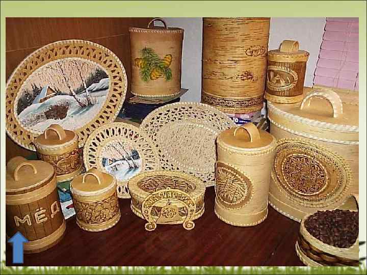 Birch-Bark. Birch bark - a cortex of the birch, Articles • • v v v v which is a unique natural material. It is ecologically clean, strangely gentle, beautiful, soft and velvety, easy to work with. Vyatka birch bark souvenirs are: Containers for food (bread, milk, salt, pepper, etc. ) Boxes for jewelry Icons Souvenir medals depicting Vyatka cathedrals Plates for bread and other food Vases for flowers Cups, and much more.