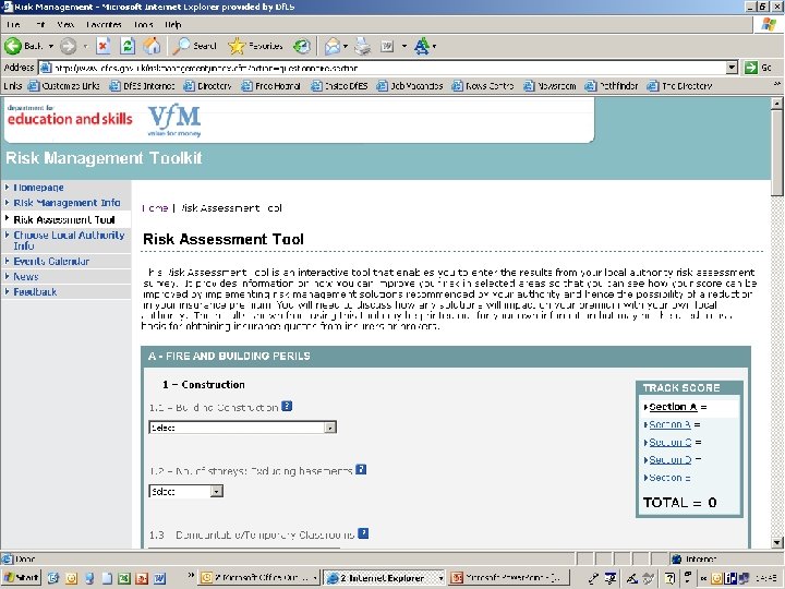 The website comprises: l l l l A risk assessment toolkit with advice for schools to improve their risk ranking Guidance on risk management Health & Safety guidance and check list General risk management information Web links to other risk management sites Access to local risk management information News and events pages Other information
