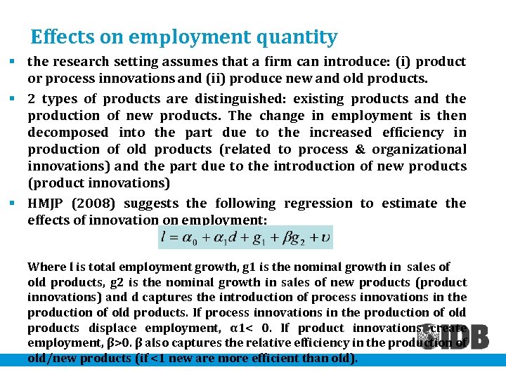 Effects on employment quantity § the research setting assumes that a firm can introduce: (i) product or process innovations and (ii) produce new and old products. § 2 types of products are distinguished: existing products and the production of new products. The change in employment is then decomposed into the part due to the increased efficiency in production of old products (related to process & organizational innovations) and the part due to the introduction of new products (product innovations) § HMJP (2008) suggests the following regression to estimate the effects of innovation on employment: Where l is total employment growth, g 1 is the nominal growth in sales of old products, g 2 is the nominal growth in sales of new products (product innovations) and d captures the introduction of process innovations in the production of old products. If process innovations in the production of old products displace employment, α 1< 0. If product innovations create employment, β>0. β also captures the relative efficiency in the production of old/new products (if <1 new are more efficient than old).