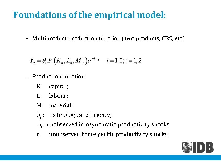 Foundations of the empirical model: – Multiproduction function (two products, CRS, etc) – Production function: K: capital; L: labour; M: material; θjt: technological efficiency; ωit: unobserved idiosynchratic productivity shocks η: unobserved firm-specific productivity shocks