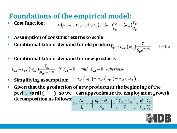 Foundations of the empirical model: § Cost function: § Assumption of constant returns to scale § Conditional labour demand for old products: § Conditional labour demand for new products § Simplifying assumption: § Given that the production of new products at the beginning of the period is nil ( ) so we can approximate the employment growth decomposition as follows: