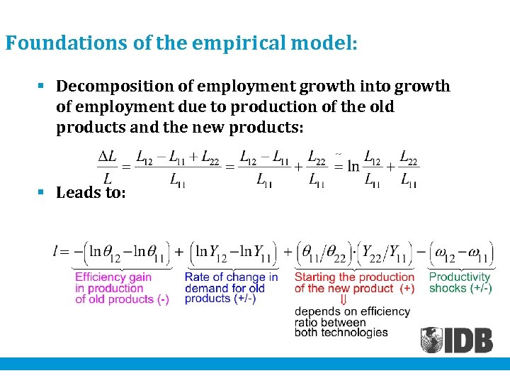 Foundations of the empirical model: § Decomposition of employment growth into growth of employment due to production of the old products and the new products: § Leads to: