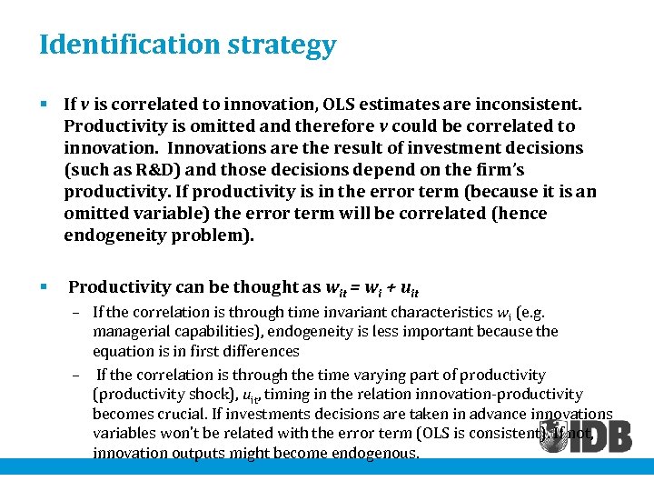 Identification strategy § If v is correlated to innovation, OLS estimates are inconsistent. Productivity is omitted and therefore v could be correlated to innovation. Innovations are the result of investment decisions (such as R&D) and those decisions depend on the firm’s productivity. If productivity is in the error term (because it is an omitted variable) the error term will be correlated (hence endogeneity problem). § Productivity can be thought as wit = wi + uit – If the correlation is through time invariant characteristics wi (e. g. managerial capabilities), endogeneity is less important because the equation is in first differences – If the correlation is through the time varying part of productivity (productivity shock), uit, timing in the relation innovation-productivity becomes crucial. If investments decisions are taken in advance innovations variables won’t be related with the error term (OLS is consistent). If not, innovation outputs might become endogenous.