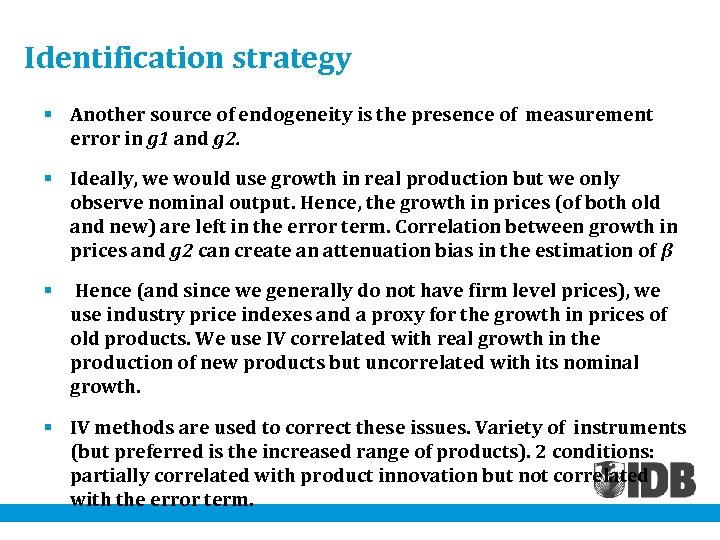 Identification strategy § Another source of endogeneity is the presence of measurement error in g 1 and g 2. § Ideally, we would use growth in real production but we only observe nominal output. Hence, the growth in prices (of both old and new) are left in the error term. Correlation between growth in prices and g 2 can create an attenuation bias in the estimation of β § Hence (and since we generally do not have firm level prices), we use industry price indexes and a proxy for the growth in prices of old products. We use IV correlated with real growth in the production of new products but uncorrelated with its nominal growth. § IV methods are used to correct these issues. Variety of instruments (but preferred is the increased range of products). 2 conditions: partially correlated with product innovation but not correlated with the error term.
