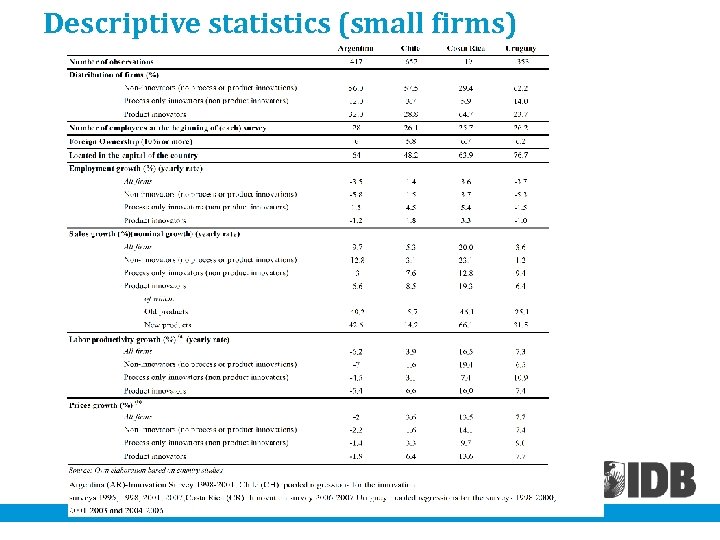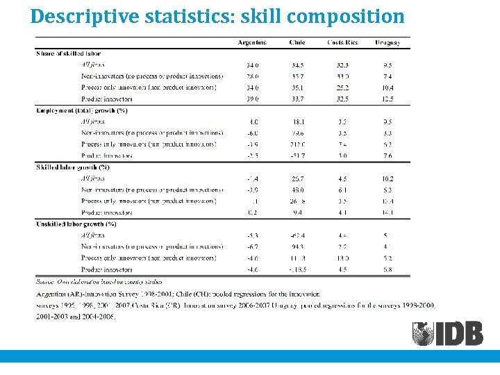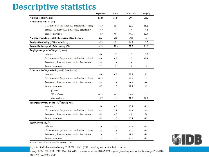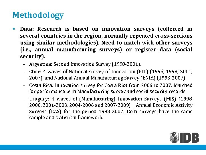 Methodology § Data: Research is based on innovation surveys (collected in several countries in the region, normally repeated cross-sections using similar methodologies). Need to match with other surveys (i. e. , annual manufacturing surveys) or register data (social security). – Argentina: Second Innovation Survey (1998 -2001), – Chile: 4 waves of National survey of Innovation (EIT) (1995, 1998, 2001, 2007), and National Annual Manufacturing Survey (ENIA) (1993 -2007) – Costa Rica: Innovation survey for Costa Rica from 2006 to 2007. Matched for performance with Manufacturing survey and social security records – Uruguay: 4 waves of (Manufacturing) Innovation Surveys (MIS) (19982000, 2001 -2003, 2004 -2006 and 2007 -2009) + Annual Economic Activity Surveys (EAS) for the period 1998 -2007. Both surveys have the sample and statistical framework.