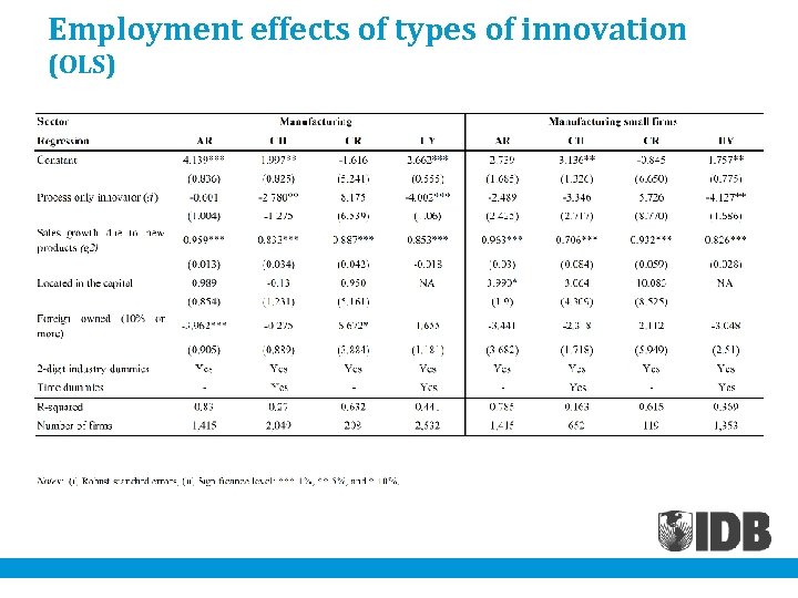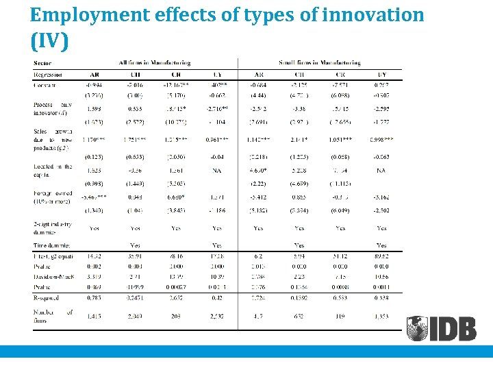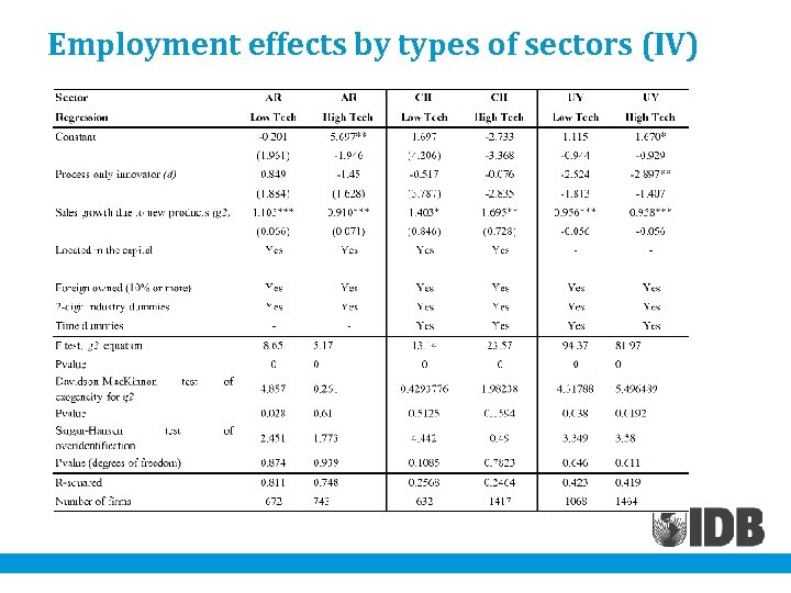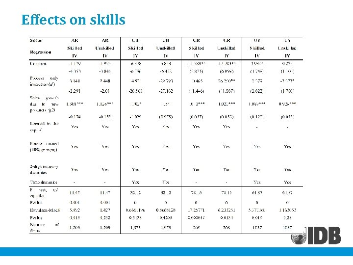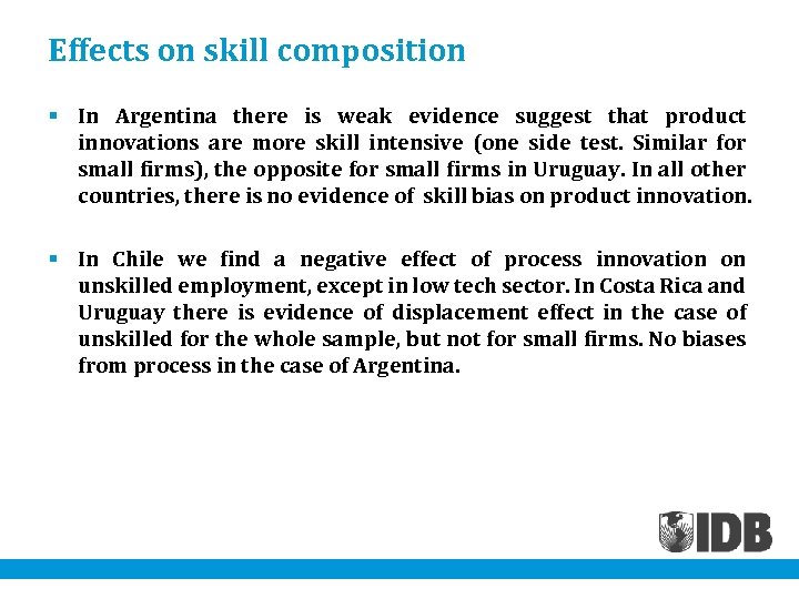 Effects on skill composition § In Argentina there is weak evidence suggest that product innovations are more skill intensive (one side test. Similar for small firms), the opposite for small firms in Uruguay. In all other countries, there is no evidence of skill bias on product innovation. § In Chile we find a negative effect of process innovation on unskilled employment, except in low tech sector. In Costa Rica and Uruguay there is evidence of displacement effect in the case of unskilled for the whole sample, but not for small firms. No biases from process in the case of Argentina.