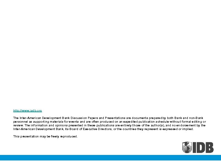http: //www. iadb. org The Inter-American Development Bank Discussion Papers and Presentations are documents prepared by both Bank and non-Bank personnel as supporting materials for events and are often produced on an expedited publication schedule without formal editing or review. The information and opinions presented in these publications are entirely those of the author(s), and no endorsement by the Inter-American Development Bank, its Board of Executive Directors, or the countries they represent is expressed or implied. This presentation may be freely reproduced.