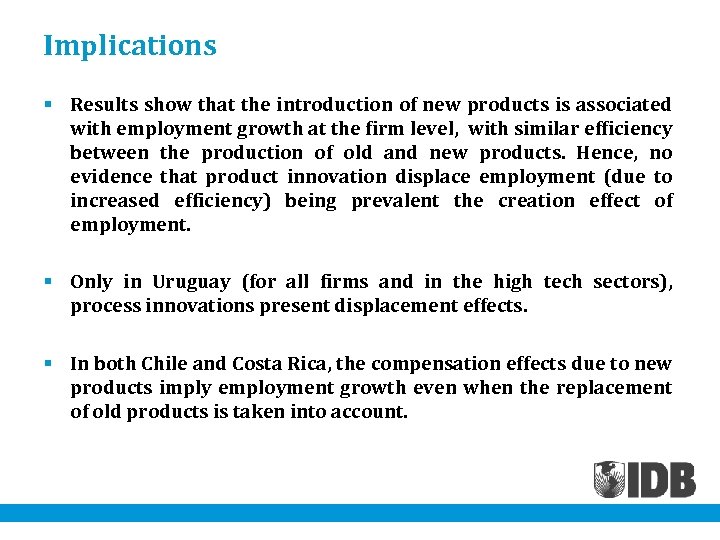 Implications § Results show that the introduction of new products is associated with employment growth at the firm level, with similar efficiency between the production of old and new products. Hence, no evidence that product innovation displace employment (due to increased efficiency) being prevalent the creation effect of employment. § Only in Uruguay (for all firms and in the high tech sectors), process innovations present displacement effects. § In both Chile and Costa Rica, the compensation effects due to new products imply employment growth even when the replacement of old products is taken into account.