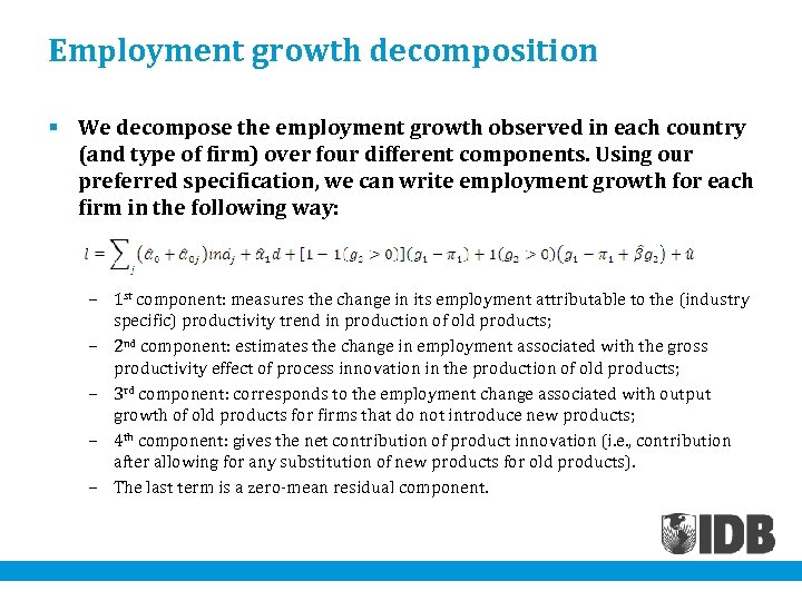 Employment growth decomposition § We decompose the employment growth observed in each country (and type of firm) over four different components. Using our preferred specification, we can write employment growth for each firm in the following way: – 1 st component: measures the change in its employment attributable to the (industry specific) productivity trend in production of old products; – 2 nd component: estimates the change in employment associated with the gross productivity effect of process innovation in the production of old products; – 3 rd component: corresponds to the employment change associated with output growth of old products for firms that do not introduce new products; – 4 th component: gives the net contribution of product innovation (i. e. , contribution after allowing for any substitution of new products for old products). – The last term is a zero-mean residual component.
