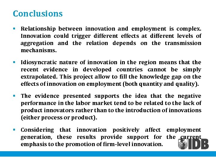 Conclusions § Relationship between innovation and employment is complex. Innovation could trigger different effects at different levels of aggregation and the relation depends on the transmission mechanisms. § Idiosyncratic nature of innovation in the region means that the recent evidence in developed countries cannot be simply extrapolated. This project allow to fill the knowledge gap on the effects of innovation on employment (both quantity and quality). § The evidence presented supports the idea that the negative performance in the labor market tend to be related to the lack of product innovators rather than to the introduction of innovations (either process or product). § Considering that innovation positively affect employment generation, these results provide support for the current emphasis to the promotion of firm-level innovation.