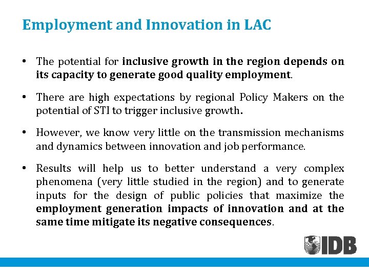 Employment and Innovation in LAC • The potential for inclusive growth in the region depends on its capacity to generate good quality employment. • There are high expectations by regional Policy Makers on the potential of STI to trigger inclusive growth. • However, we know very little on the transmission mechanisms and dynamics between innovation and job performance. • Results will help us to better understand a very complex phenomena (very little studied in the region) and to generate inputs for the design of public policies that maximize the employment generation impacts of innovation and at the same time mitigate its negative consequences.